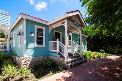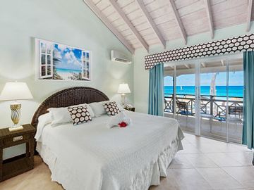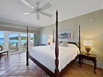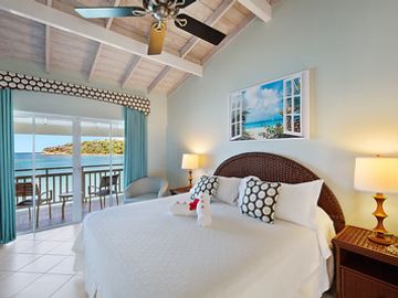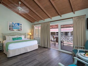 Two-story building boasts one-bedroom waterside rooms furnished with a king bed. Rooms have showers only. All rooms on 1st and 2nd floors have large private patios/balconies with a spectacular view of the ocean and Long Bay beach. 310 sq. ft. Occupancy: 2