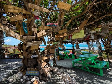 A real original, this rustic establishment sits high atop the waters of majestic Long Bay, offering a panoramic view that seems to go on forever. Show your artistic side and create a personalized sign that will immortalize your visit to this truly one-of a kind spot.